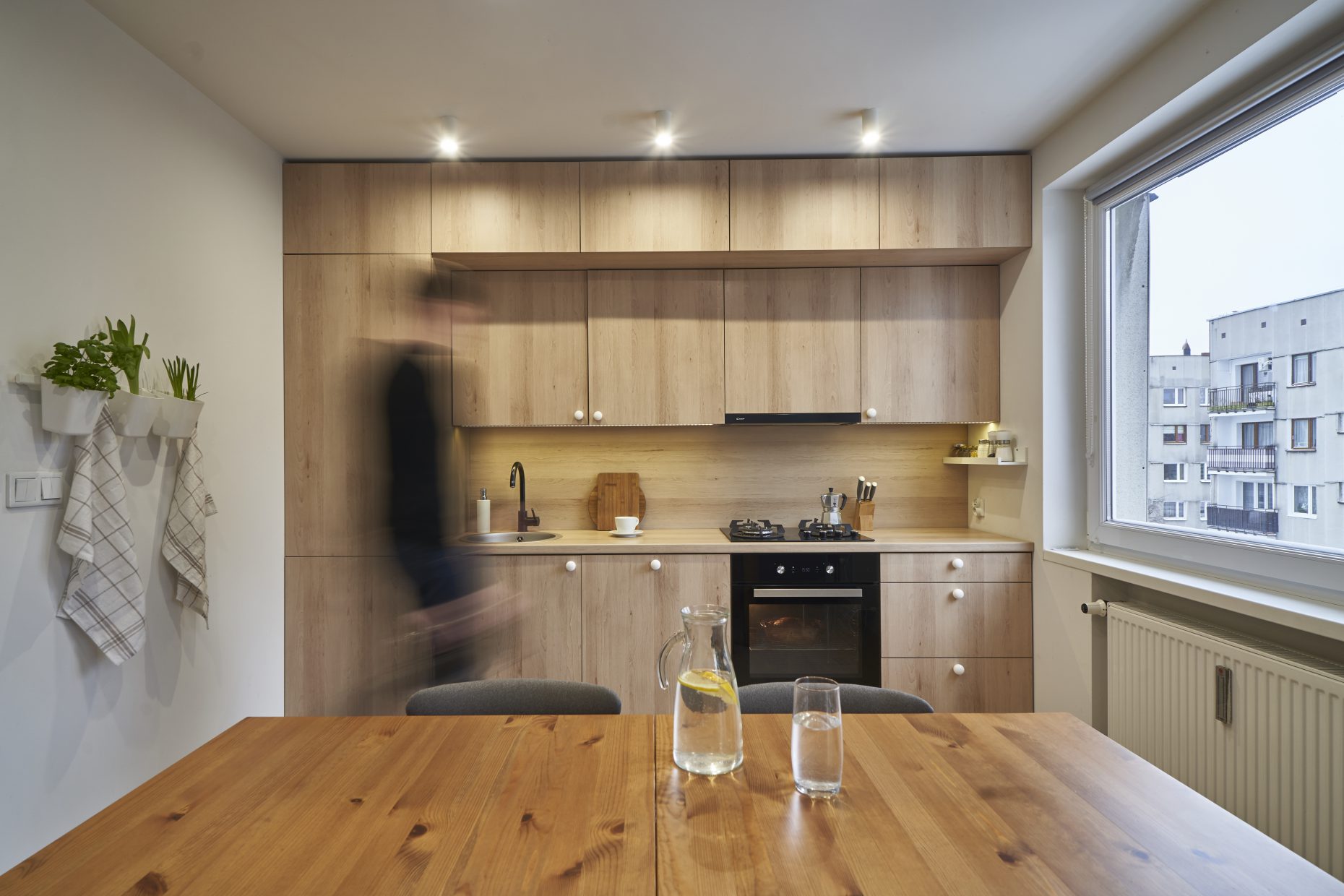 W wyniku likwidacji większości ścian działowych powstał obszerny salon z aneksem kuchennym oraz jadalnią o powierzchni ponad 30m2 do którego wchodzi się bezpośrednio po otwarciu drzwi wejściowych z klatki schodowej. Zastosowanie tego zabiegu możliwe było jedynie ze względu na to, iż inwestorzy gotowi byli na zastosowanie bezkompromisowych i radykalnych rozwiązań przestrzennych w celu uzyskania dużej przestrzeni na stosunkowo niewielkiej powierzchni użytkowej. W dawnym pokoju dziennym, zaaranżowaliśmy wygodną sypialnię z miejscem do pracy. Dwa osobne, bardzo ciasne pomieszczenia Łazienki i WC połączone zostały w jedną minimalistyczną łazienkę z zabudowaną pod blatem pralką, umywalką i przestrzenią gospodarczą. Jedna ze ścian salonu zabudowana została w całości szafa na pełną wysokość pomieszczenia z wnęką na drzwi do sypialni.
